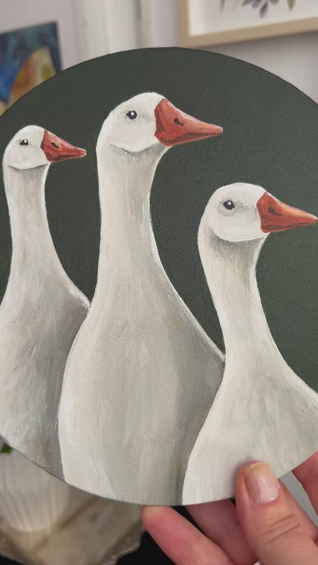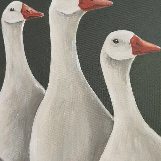 “Three Geese” Acrylic Naïve Folk Art, Round Canvas, 20 cm